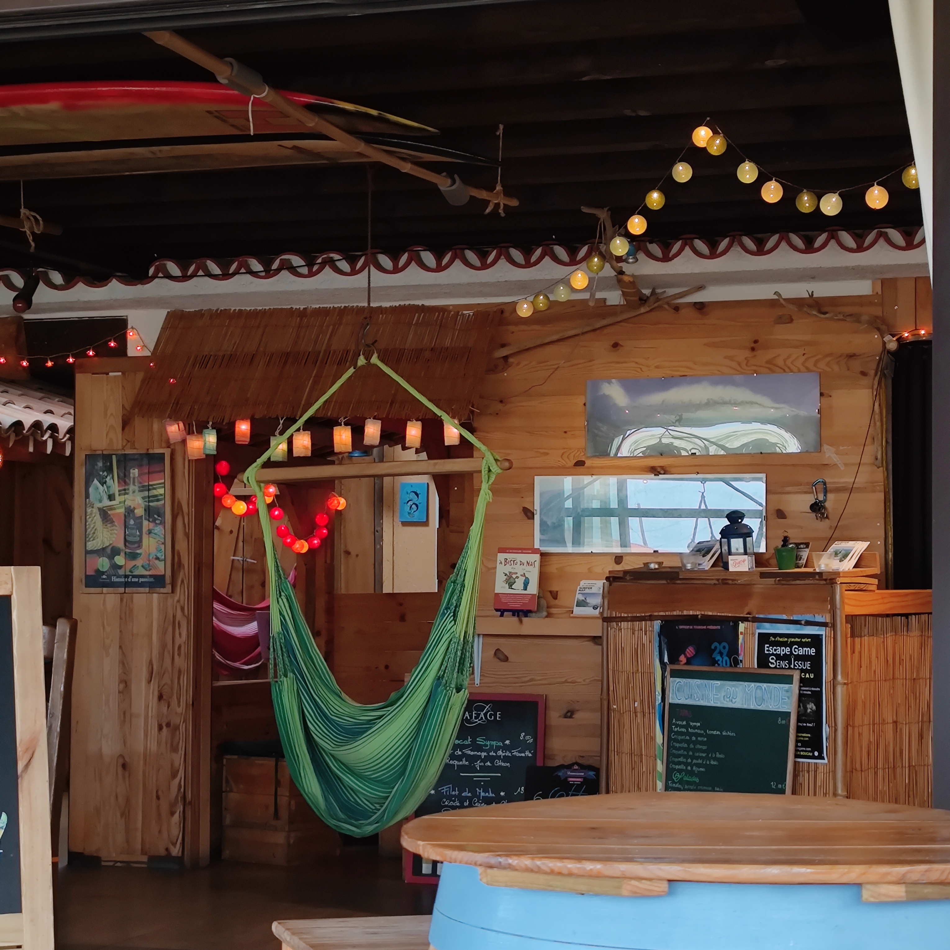 La Vague, on en avait un bon souvenir, un jour de vent, sur la plage c'était pas terrible, on s'est réfugié là. Toujours le même look, un peu moins de hamac peut-être, les cocktails excellents, car s'est un bar à rhum et cocktail. On a été très bien reçu à 8 personnes avec une poussette. On a essayé une planche, c'est déjà moins leur truc, les produits sont bons mais ce n'est pas en grande quantité (pour plus de 20€).